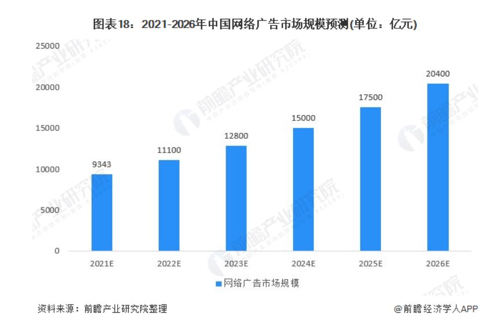 根据前瞻产业研究院的报告,中国网络广告市场规模仍在不断增长。预计在2026年前,中国网络广告市场年复合增长率能保持在17%,市场规模有望突破2万亿。