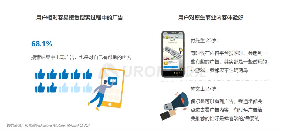 同样来自极光数据的报道显示,68.1%的用户表示,在使用内容搜索平台时,原生商业广告会对自己有一些帮助,甚至会因为广告产生需求和后续的消费行为。