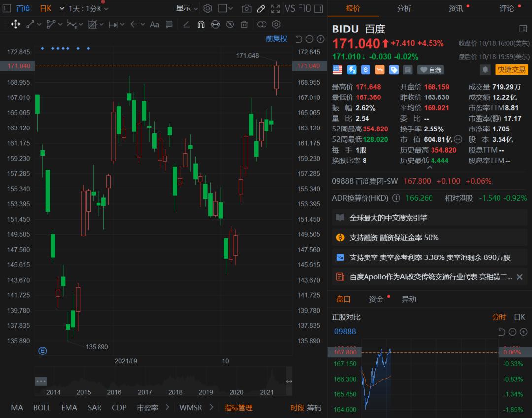 周一亚盘盘末,港股百度集团股价短线走高,最高涨至167.7港元,收涨4.16%。来到晚间美盘时段,美股百度股价继续直线上扬,同样收涨逾4%,一扫上周4个交易日收跌的颓势。