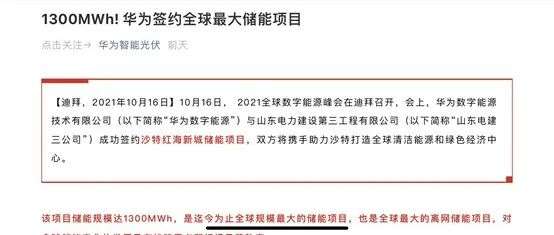 图:华为签约全球最大规模储能项目的消息。来源:华为智能光伏公众号