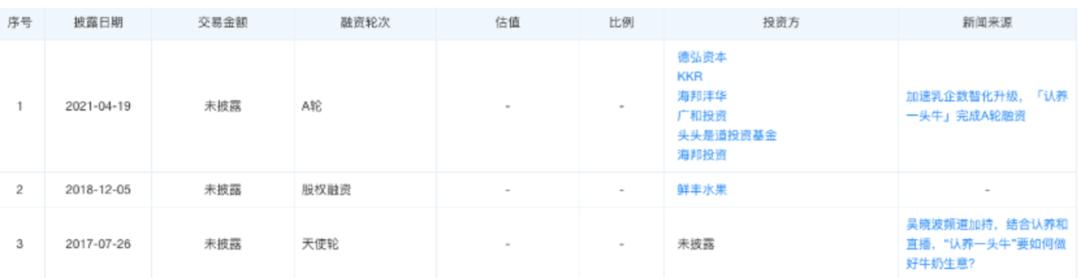 启动IPO之前,认养一头牛已经完成三轮融资,最近一次是今年4月的A轮融资,由KKR、德弘资本联合领投,具体融资金额并未披露,资金主要用于扩大上游奶牛养殖规模、加速企业的数智化升级和产业链精细化运营。此前的两轮融资分别发生于2017年和2018年。