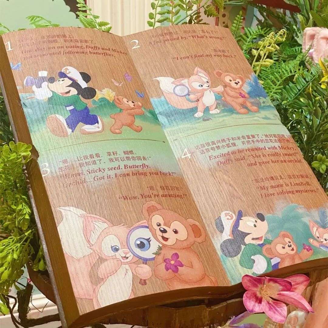 达菲家族近十年的变化,正是迪士尼将乐园IP形象人格化的尝试。他们虽然没有线上成体系的动画片,但在线下有逐渐丰满的故事线。在达菲家族的周边商品里都会有个折叠的小卡片,打开后是每个成员的连环画。每个家族人物都有专属的背景故事和人物性格,乃至职业属性,比如杰拉多尼是画家猫,奥乐米拉是来自夏威夷的音乐家海龟。