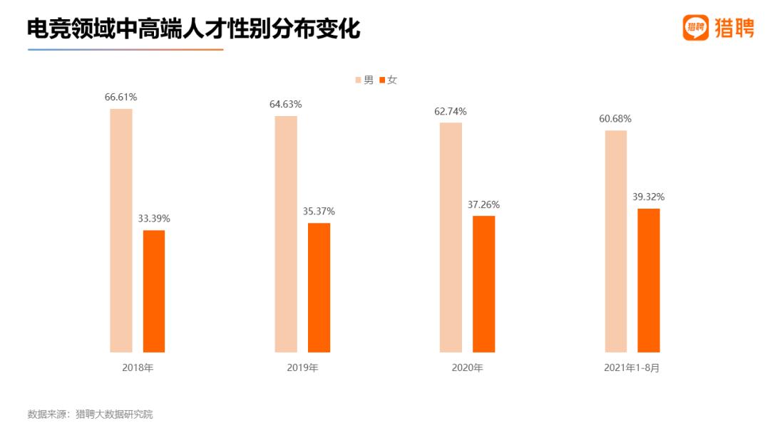 2 018年女性占比为33.39%,2019、2020年分别为35.37%、37.26% 。 2021年1-8月,女性中高端电竞从业者占整体电竞从业者的39.3 2%。 这意味着更多女性参与电竞 事业,成为推动电竞发展的重要力量。