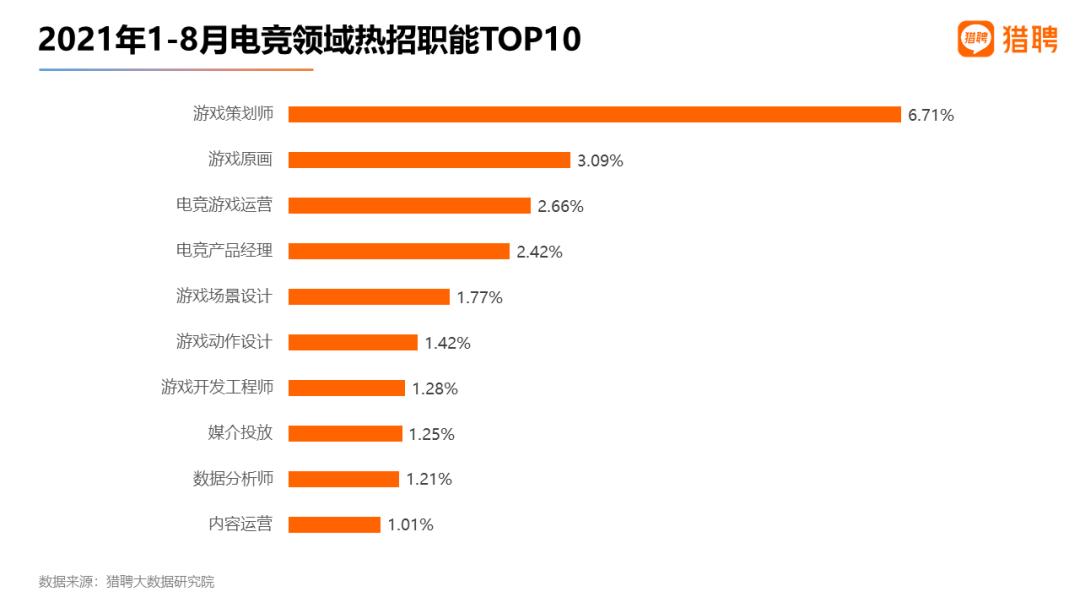 从2021年1-8月的电竞热招职能TOP10来看,游戏策划师位居第一,占比为6.71%。电竞既具有娱乐性,又具有体育赛事性质的对抗性,因而对策划、设计、运营较为重视。
