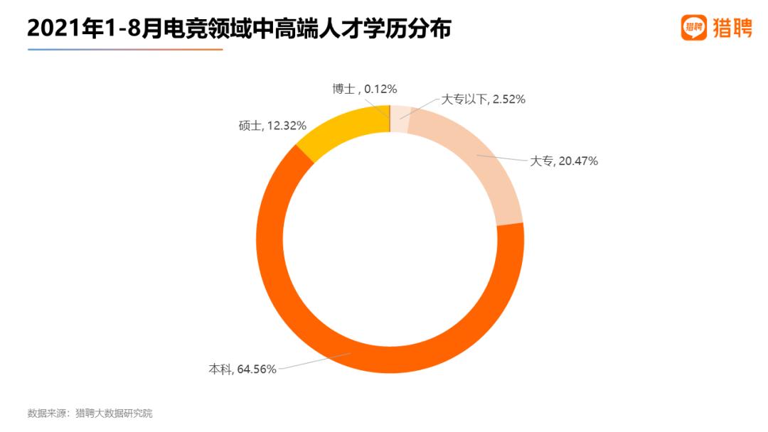 从2021年1-8月电竞中高端人才学历构成来看,本科学历占主流,占比为64.56% ; 其次是大专,占比为20.47%。 电竞是实战性较强的领域,对学历的门槛要求不高。 不过,这个领域仍有硕博学历的身影,两者占比为12.32%、0.12%。