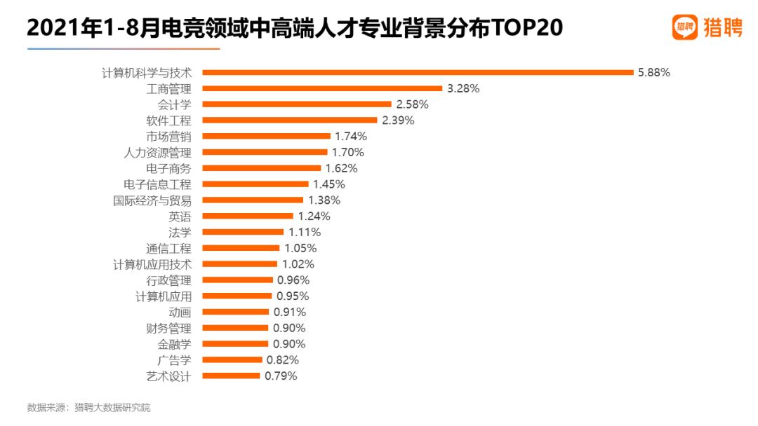 在2021年1-8月电竞中高端人才专业背景分布前20中,计算机类专业占到4席,计算机科学与技术以5.88%的占比居首。电竞涉及到赛事运营、内容传播、开发、发行、衍生品等板块,对人才专业背景的要求也比较多样化,与经济、外语相关的专业也榜上有名。