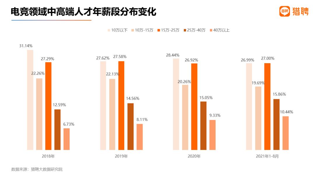 从电竞中高端从业者薪资段分布的变化来看,10万年薪以下的人才占比在减少,从2018年的31.14%下降到2020年的28.44%,下降了2.7个百分点。 2021年1-8月,10万以下从业者占比为26.99%。