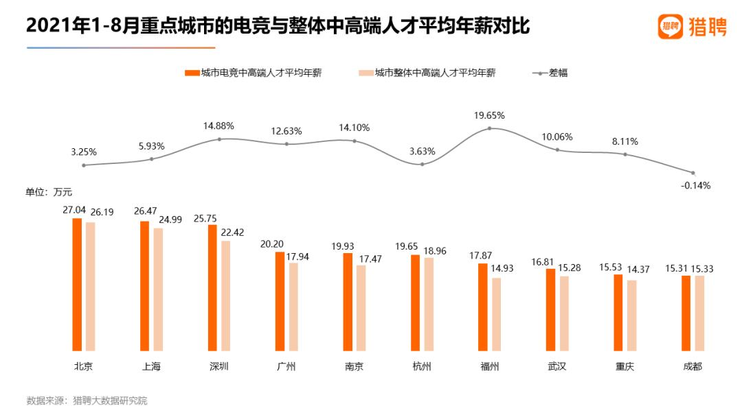 在2021年1-8月电竞中高端人才排名前十的城市中,电竞人才的薪资均总体上高于本地中高端人才平均薪资。