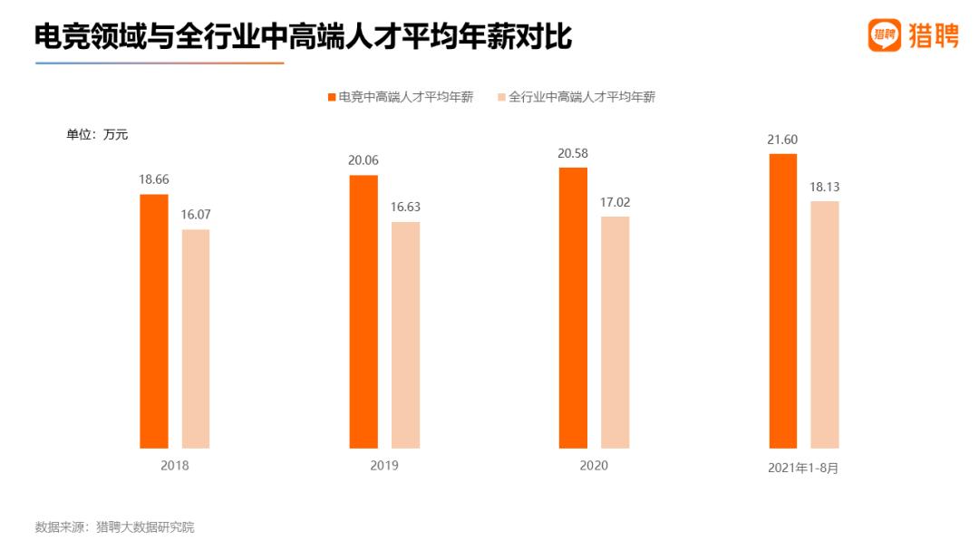 从2018年到2020年,电竞 领域中高端人才的平均年薪从18.66万元增长至2020年的20.58万元,2021年1-8月为21.60万元。