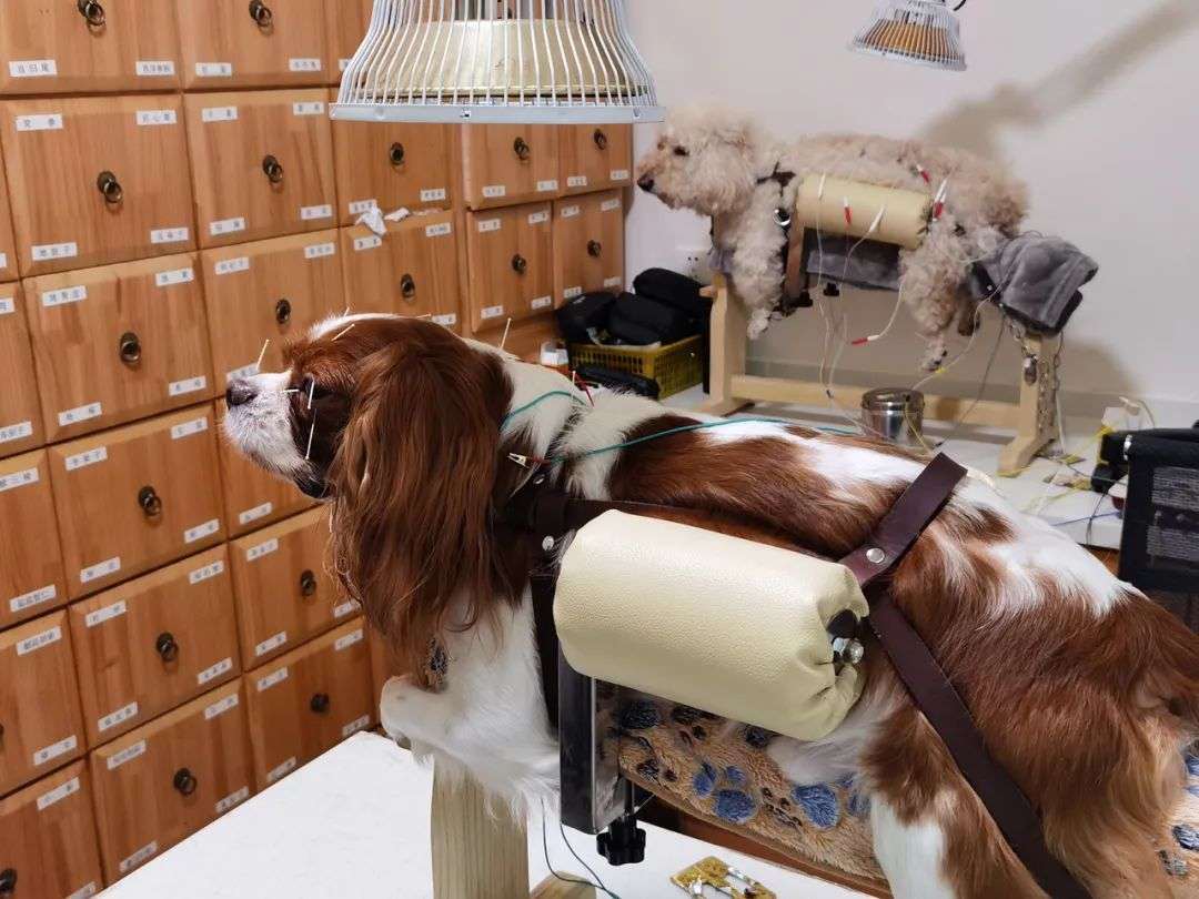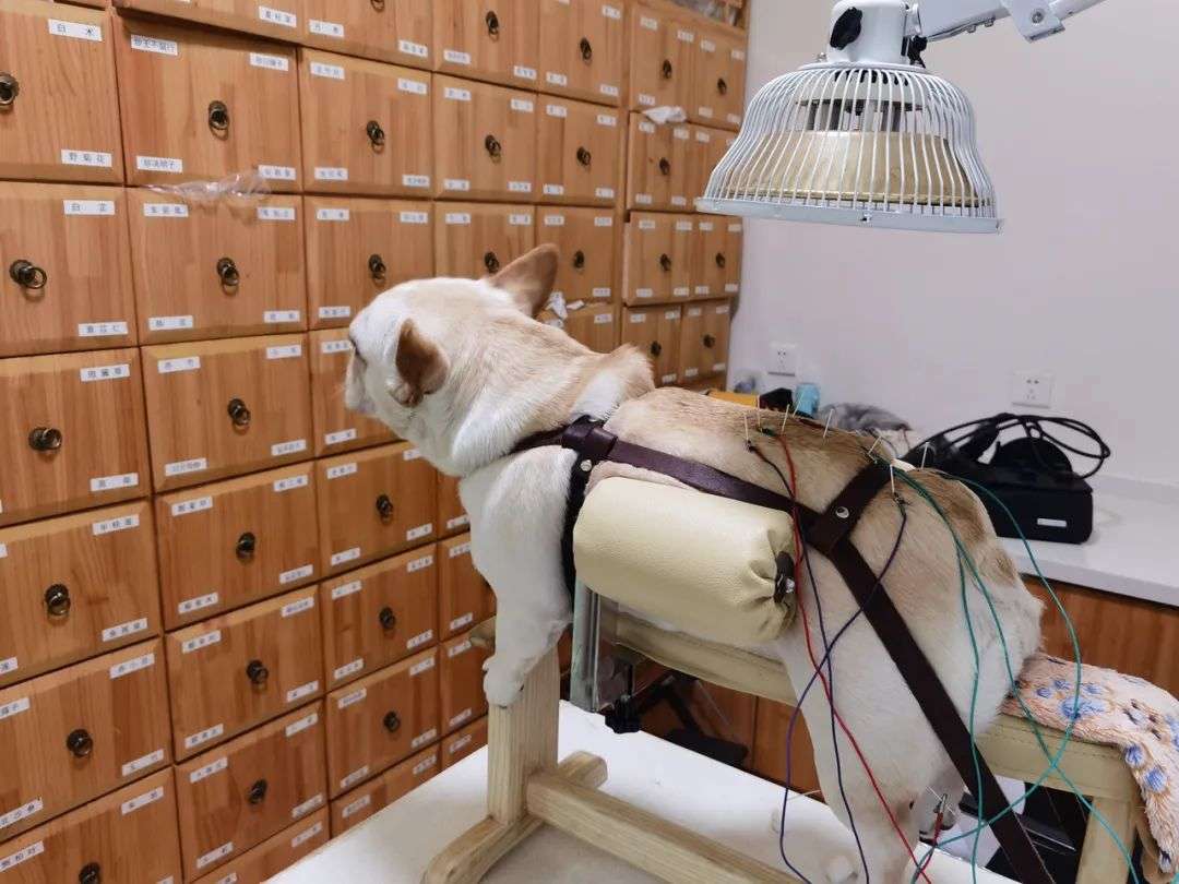 针灸是中医在宠物医疗方面应用最广的疗法。宠物们被固定在专用的针灸架上,等着医生用针扎进不同穴位。针灸架旁边通常会放置一台红外线理疗灯,作为辅助治疗,再点燃艾灸,在宠物们附近熏烤。