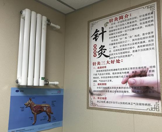走进店里,橙黄色调的墙上挂着针灸、中医腑脏理论的海报,看上去与普通中医馆无异。只是海报上的猫犬配图,提醒着来人,这是适用于宠物的中医。