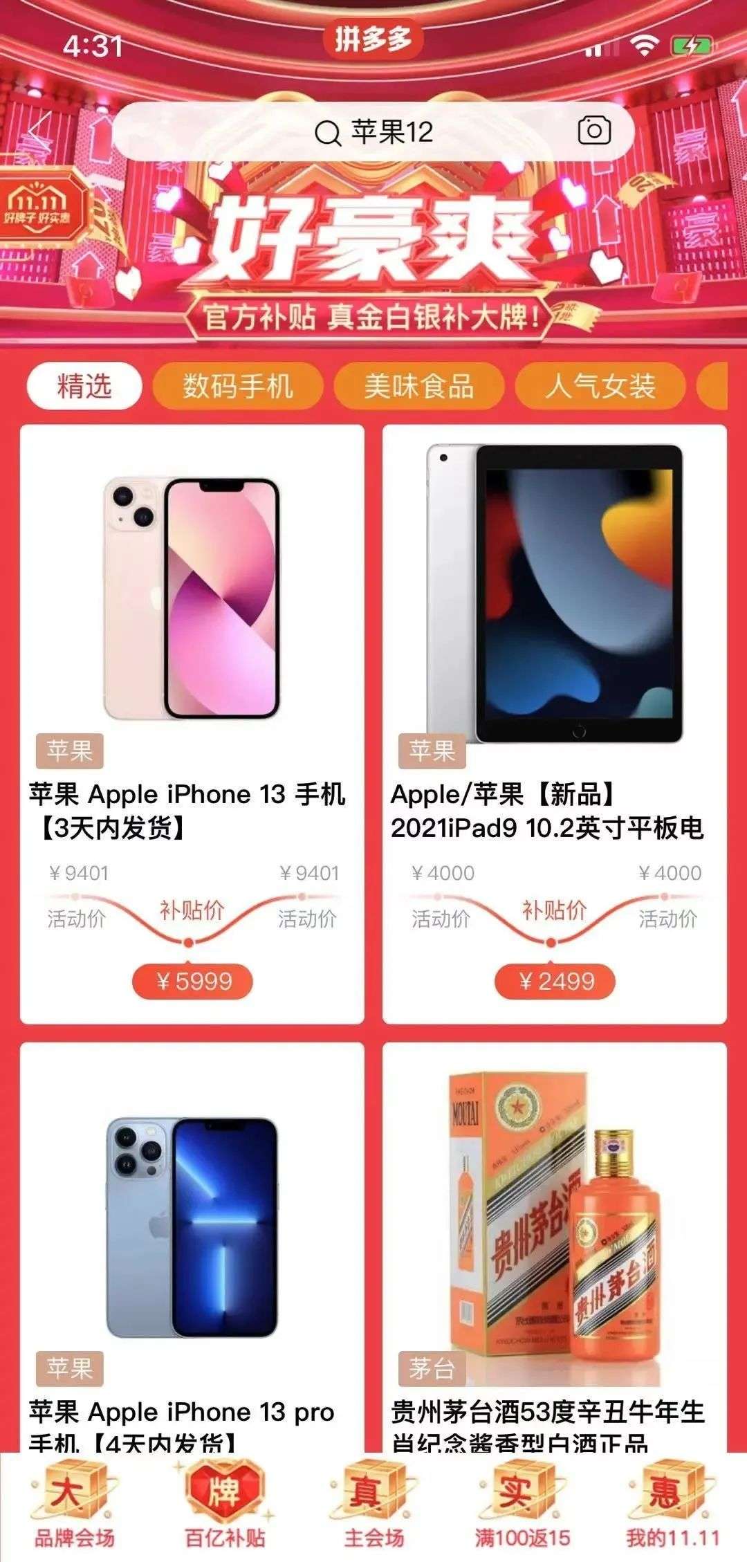 拼多多最让人熟知的就是百亿补贴,双11期间,拼多多在补贴上又出大手笔,在手机、家电、数码、美妆等领域加大补贴力度,为近200个品牌的20000余种产品提供无上限的消费补贴。此外,促销期间,拼多多每天还会推出近10个精选产品的“秒杀万人团”,加入万人秒杀团得到的优惠也会更多。