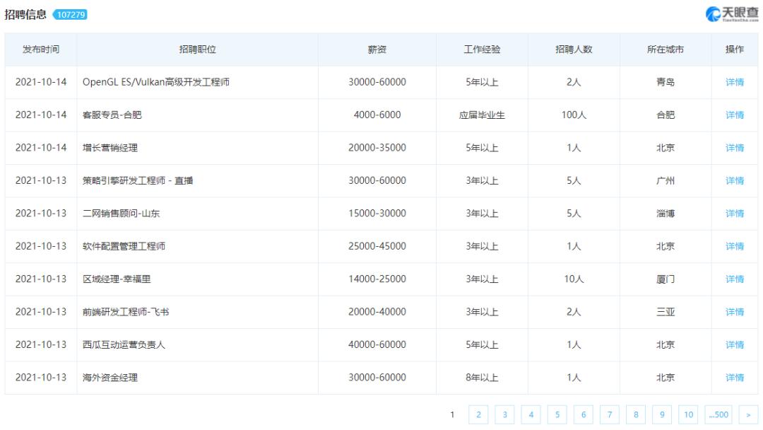 同时,抖音打造的兴趣电商,虽然有着“货找人”的精准投放优势,但无论是短视频的“种草”,还是直播带货的情绪化鼓动,都是建立在消费者思考时间较短的冲动消费基础上,不可避免会出现高退货率和低复购率的问题。打造独立的综合电商平台,可以有效弥补现有的短板,增加消费者主动消费的驱动力,同时也能有效缓解被第三方电商平台“薅流量羊毛”。从天眼查所显示的字节跳动近期的招聘计划中,也能大概看出对构建新电商平台的重视。