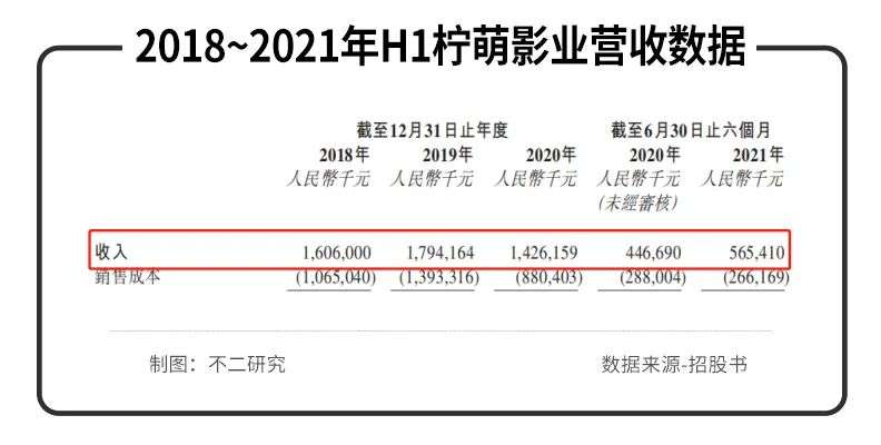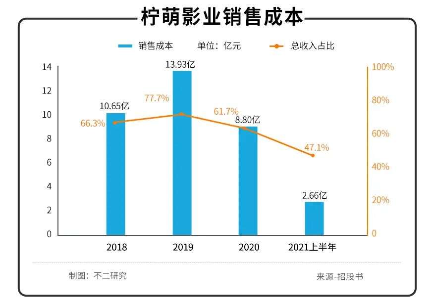 招股书显示,2018~2021年上半年,柠萌影业的销售成本分别为10.65亿、13.93亿、8.80亿、及2.66亿元,总收入占比66.3%、77.7%、61.7%及47.1%。