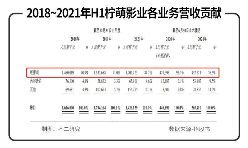 柠萌影业的收入结构较为单一,版权剧授权贡献了绝大多数营收。根据招股书,2018~2021上半年,柠萌影业版权剧授权收入分别为14.60亿、16.33亿、12.07亿和4.33亿元,占总营业收入的90.9%、91.0%、84.7%及76.5%。