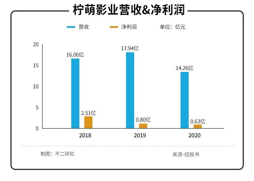 「不二研究」从招股书发现:2018~2020年,柠萌影业营收16.06亿、17.94亿、14.26亿,净利润2.51亿、0.80亿、0.63亿,均处于持续波动中,并有下滑态势。