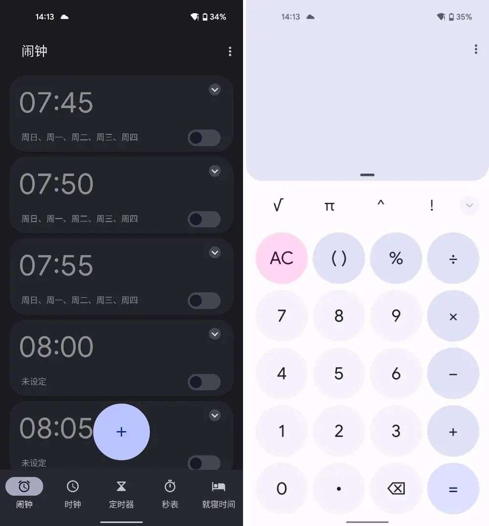 为了让系统上线第一时间时 Material You 设计能彻底改造系统,Google 对旗下多款应用进行了调整,包括新的设计语言适配、黑暗模式适配、触控动画调整等等,现在的系统计算器就已经用上了 Material You。