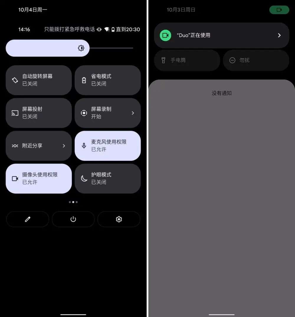 相机、麦克风锁定将默认显示在下滑菜单栏中,快速启用也十分方便,一旦有应用启用了这两项功能,通知栏还会有专门的高亮绿色或黄色提示图标,提示用户。