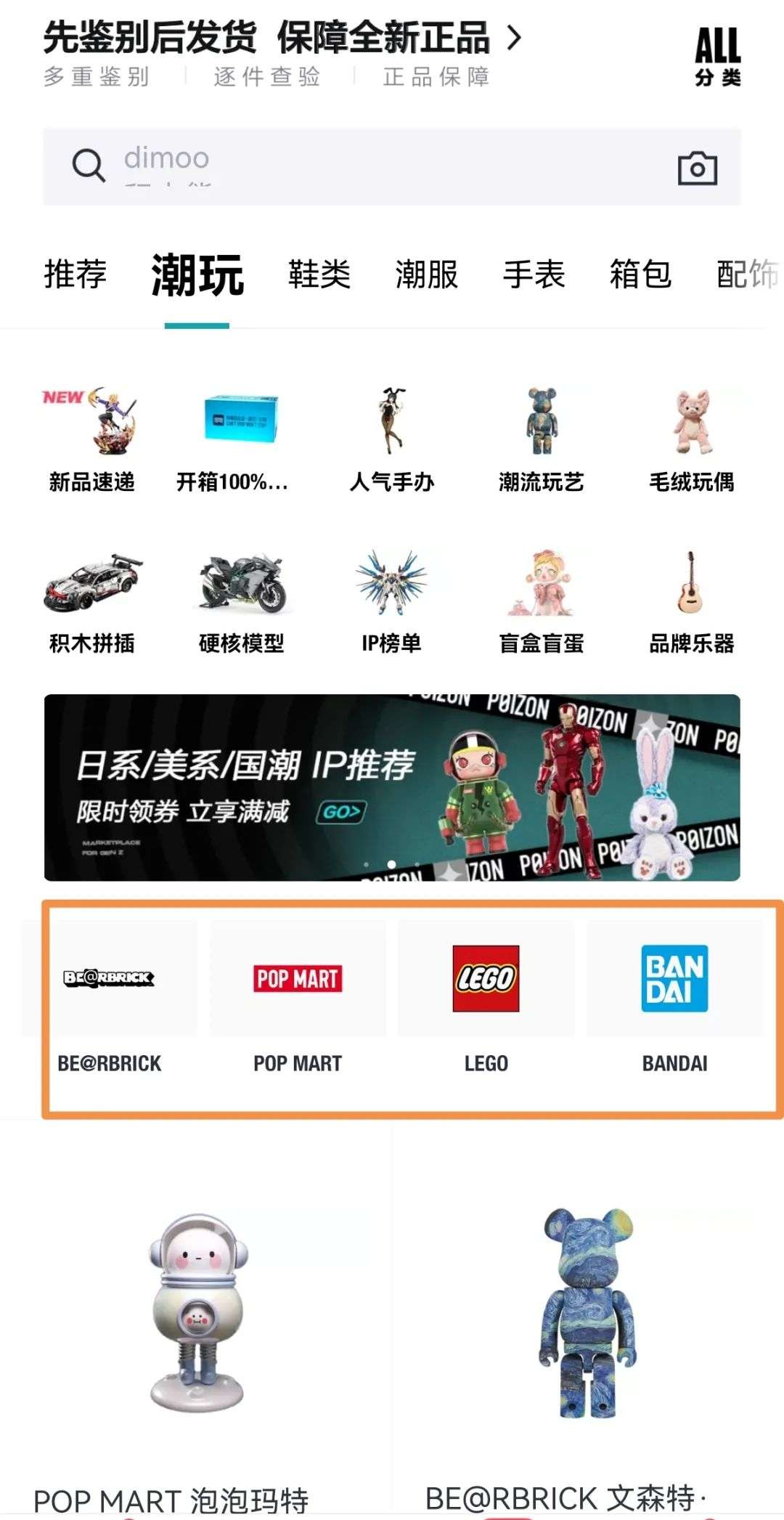 当前的得物平台内设立有专门的“潮玩”页面,其中,BE@RBRICK、POPMART、乐高和万代拥有专区,且关注人数均超过4万。