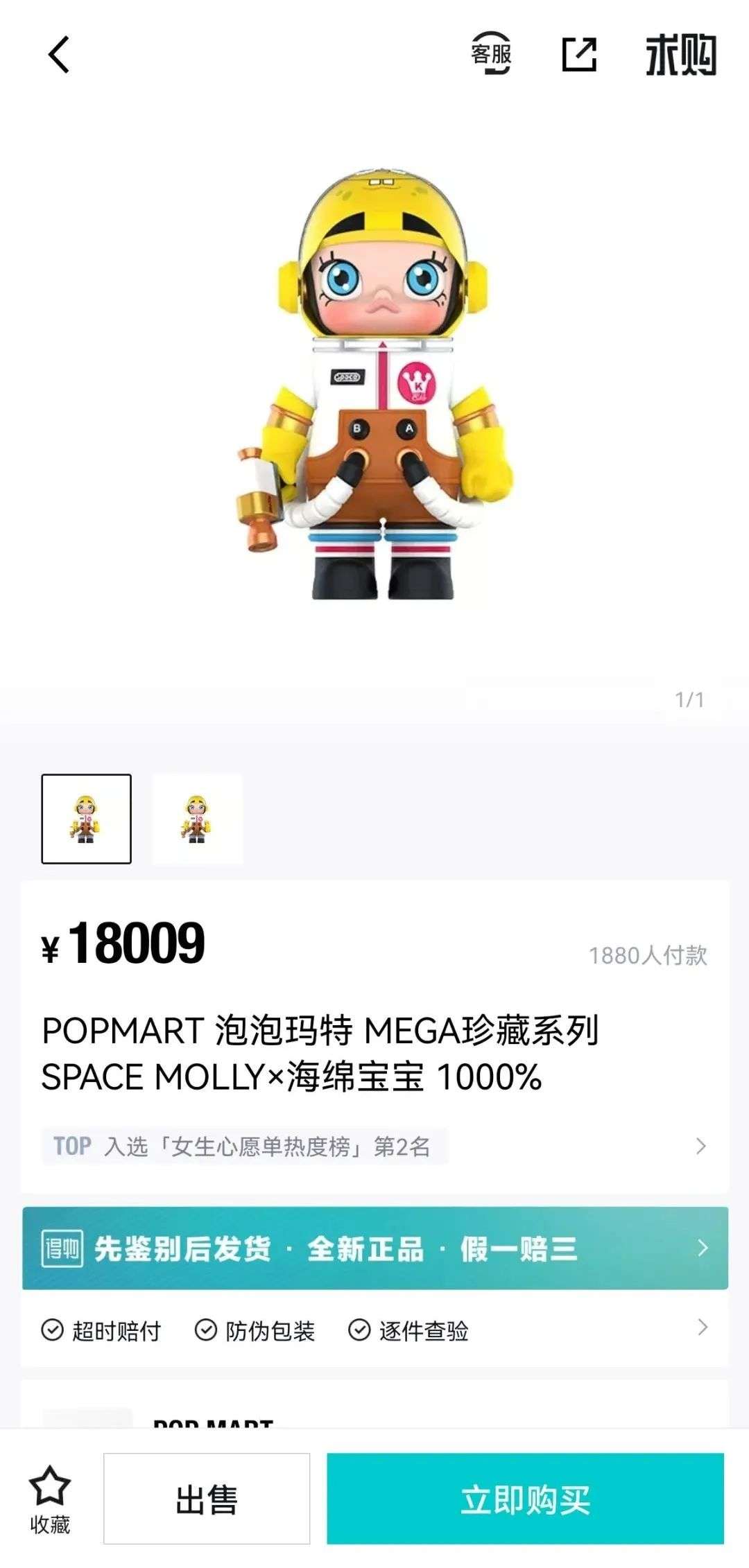 泡泡玛特专区的封顶价格和溢价不如积木熊夸张,最高价为一款9.8万的70cm设计师联名大娃。其余高价单品大多在1-2万元范畴内。高价单品大多溢价5-6倍,鲜少超过10倍。但万元上下的单品市场更为火热,SPACE MOLLY系列的一款与海绵宝宝联名的70cm大娃,被炒至2万元上下,在得物上显示付款人数达到1880人。