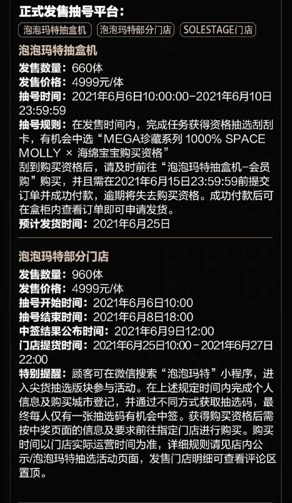 以泡泡玛特发行的一款大娃为例。大多在发售一周前,泡泡玛特的官微、公众号以及电商旗舰店便会发布新品通知,明确这次联名款的外观、售价、发售形式。