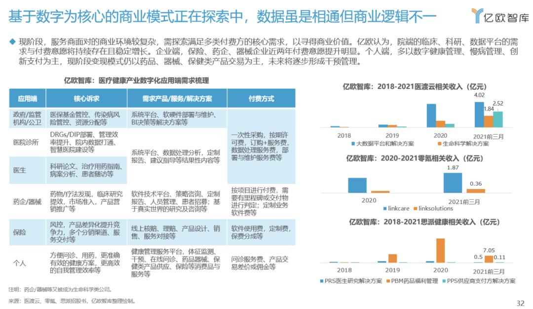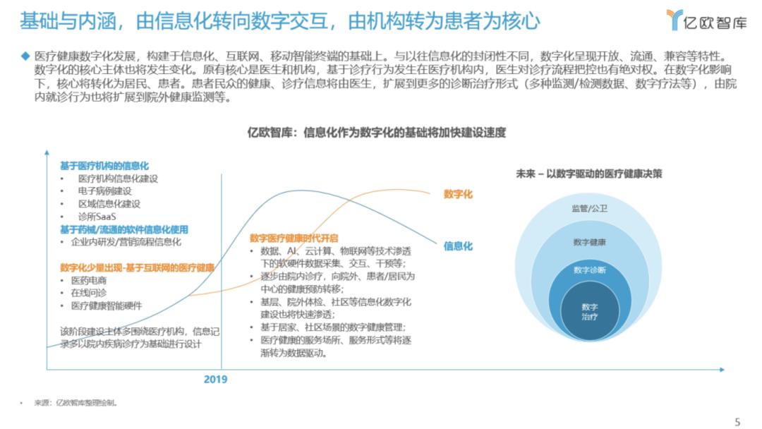 数字化的渗透链条较长,亿欧智库认为这将会是一个从院内到院外、从治疗到预防、从顶端到基层,数字流动打通的过程。此外,数据维度的互通也标志着行业成熟的发展,从挂号用药、轻问诊、体征监测、再到真实世界数据的流动,也预示着数字化渗透逐渐成熟。