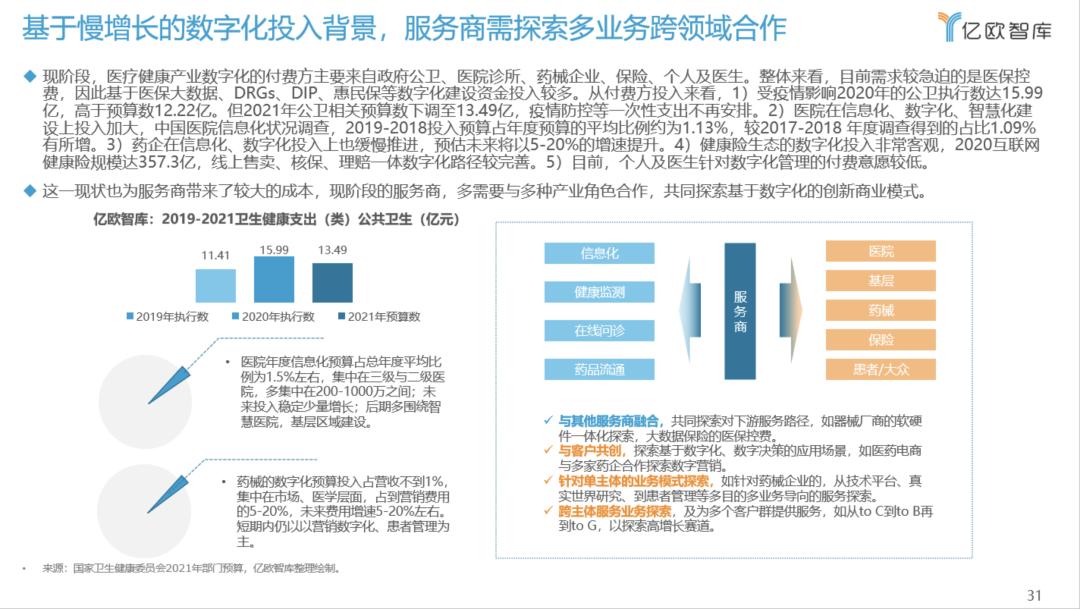 基于慢增长的现实,服务商需探索满足多类付费方的核心需求,以寻得商业价值。当然,企业也需要在慢增长中寻找快赛道。亿欧智库认为,院端的临床、科研、数据平台的需求与付费意愿将持续存在且稳定增长,企业端,保险、药企、器械企业近两年付费意愿提升明显。