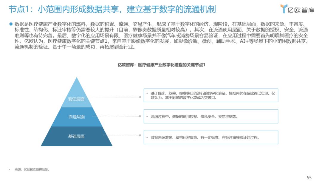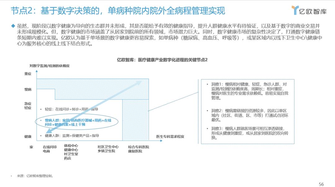 亿欧智库认为,医疗健康产业的数字化有两个关键节点,其一是数字共享、流通、交易机制的建立。该机制可降低企业运营风险,探索规模化发展;其二是基于数字决策的单病种全病程的管理干预,该节点预示着基于数字模式的打通,也为探索更多可复制、规模化的商业模式提供参考建议。