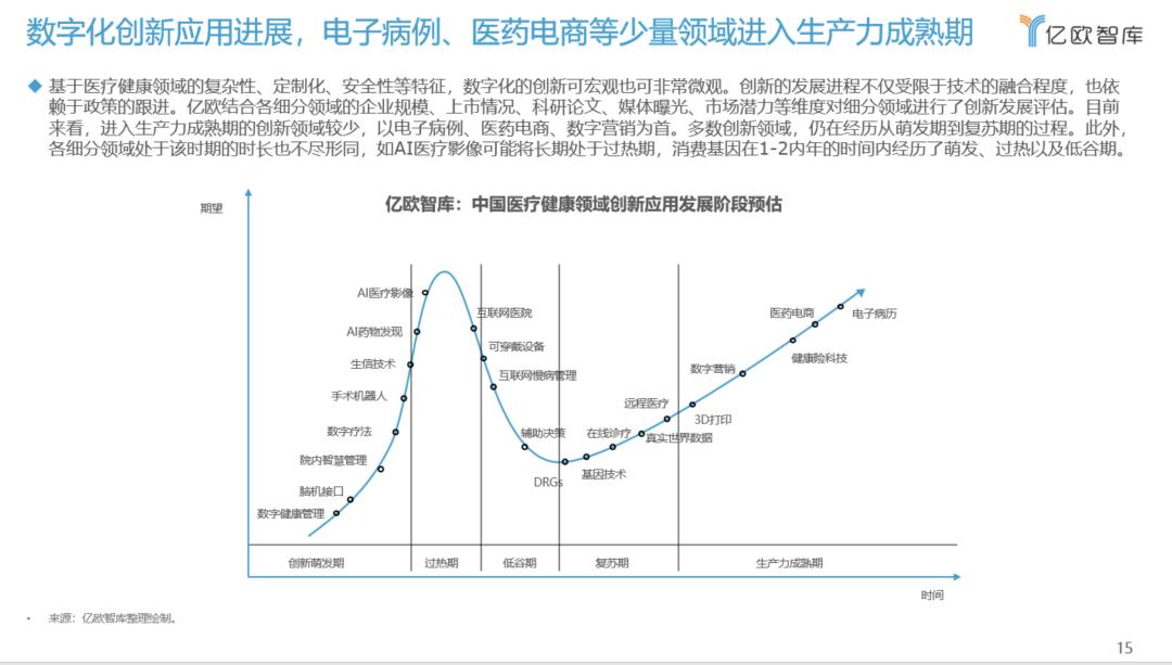 数字化创新应用进展中,电子病例、医药电商等少量领域进入生产力成熟期