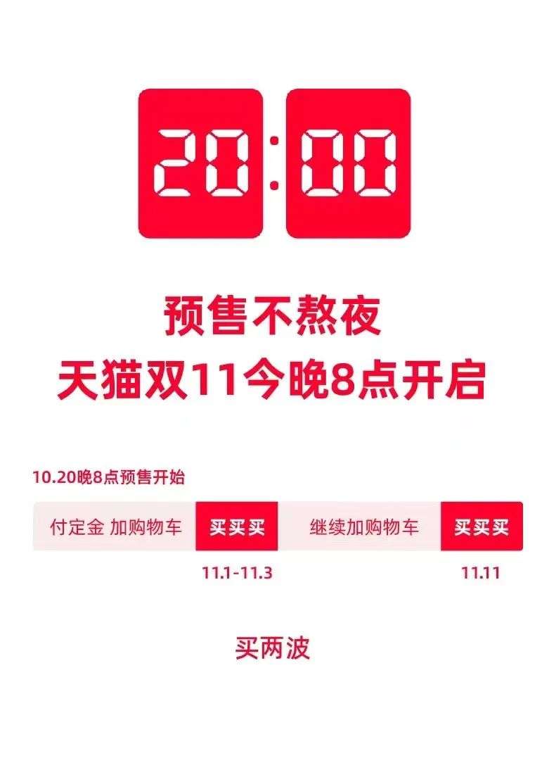 今年双11预售的时间也分两波进行。两波预售时间都提前到了晚上20点。10月20日晚20点启动第一波预售,11月4日晚20点开启第二波预售。