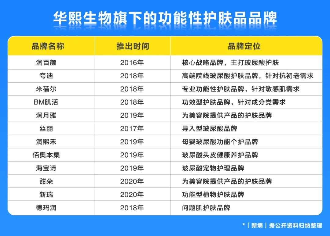 目前,华熙生物旗下有12个功能性护肤品品牌,「新熵」观察发现,这些子品牌可以大致划分为三类。