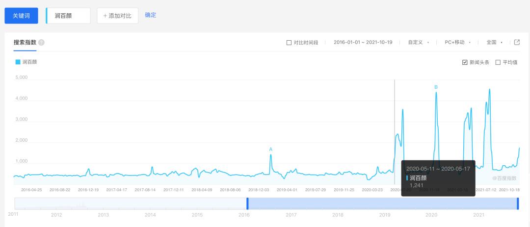 2020年5月起,润百颜的搜索热度明显提升