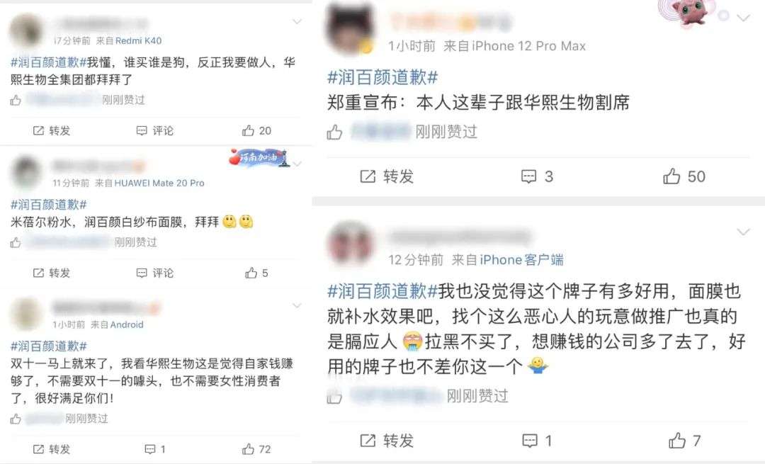 10月16日晚,润百颜官方微博发表道歉声明承诺整改。但损失难以挽回,10月18日周一开盘,华熙生物股价当即低开跌幅6.35%,市值蒸发55.97亿。原定20号上架薇娅直播间的润百颜,也被临时取消坑位。目前,微博话题#润百颜道歉#的阅读量达1.5亿,且不断有消费者加入讨论。在距离双十一不到一个月之际,“当红王牌”润百颜陷入舆论风波,无疑将直接影响其整个双十一战绩。