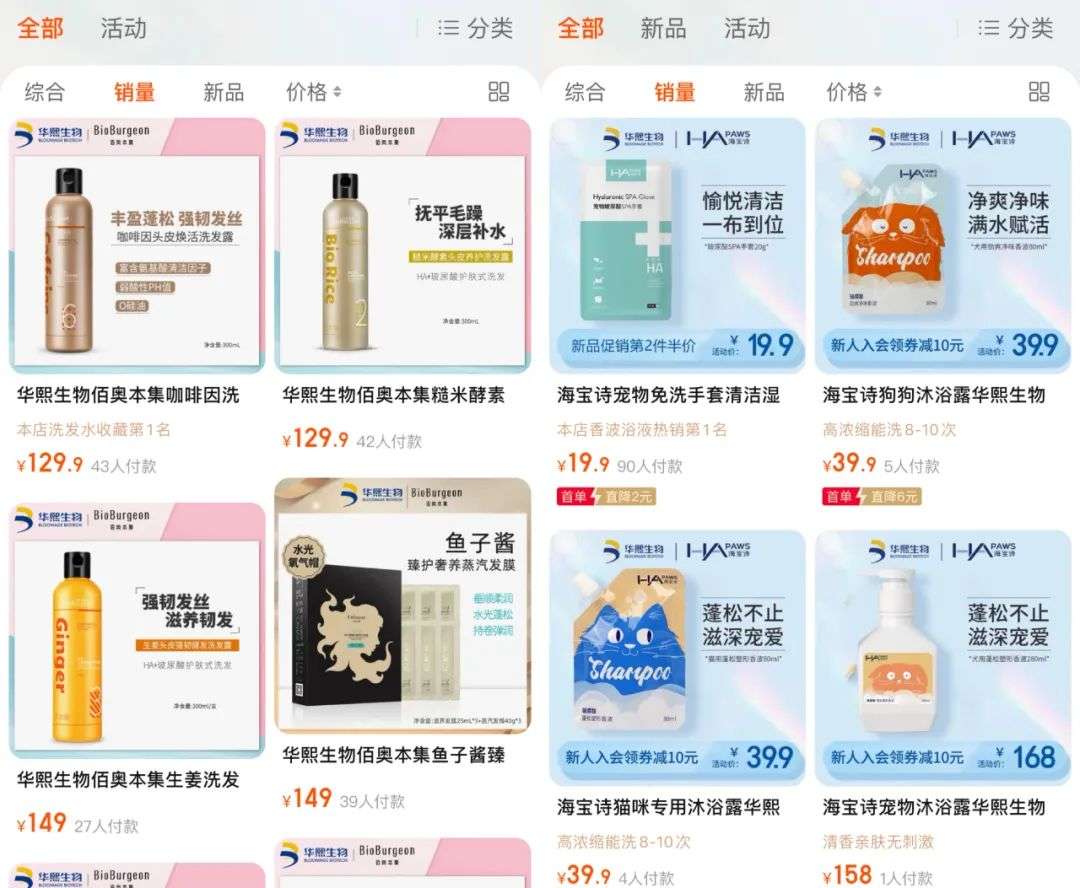 此外,主打头皮护理的佰奥本集和主打宠物护理的海宝诗,售价均较高。以佰奥本集的玻尿素护发素为例,300毫升规格的价格约为130元,高于市面上的绝大多数护发产品。海宝诗的产品价格也很高,宠物沐浴露等产品的价格均在160元左右。