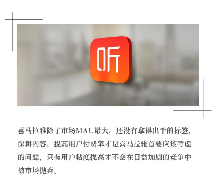 曾同场竞技的得到APP跑成了市场公认的“知识付费野马”,专业的在线课程让用户心甘情愿掏了腰包。而喜马拉雅除了市场MAU最大,还没有拿得出手的标签,深耕内容、提高用户付费率才是喜马拉雅首要应该考虑的问题,因为只有用户粘度提高才不会在日益加剧的竞争中被市场抛弃。