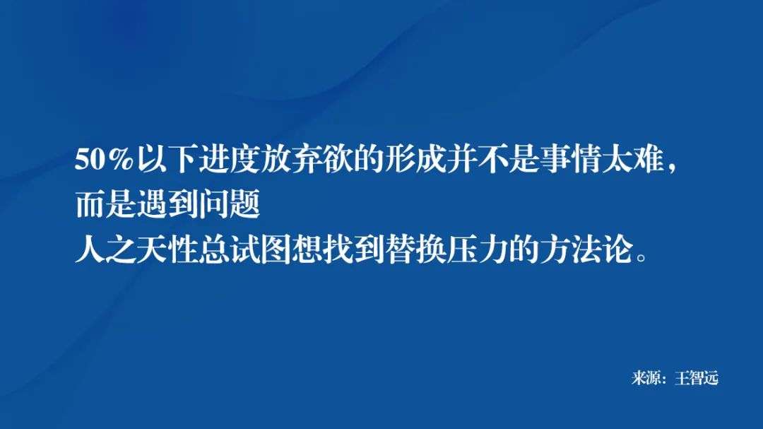 总而言之,50%以下进度放弃欲的形成并不是事情太难,而是遇到问题人之天性总试图想找到替换压力的方法论,最后造成「潜意识心理厌倦感」,做什么都没有耐心。