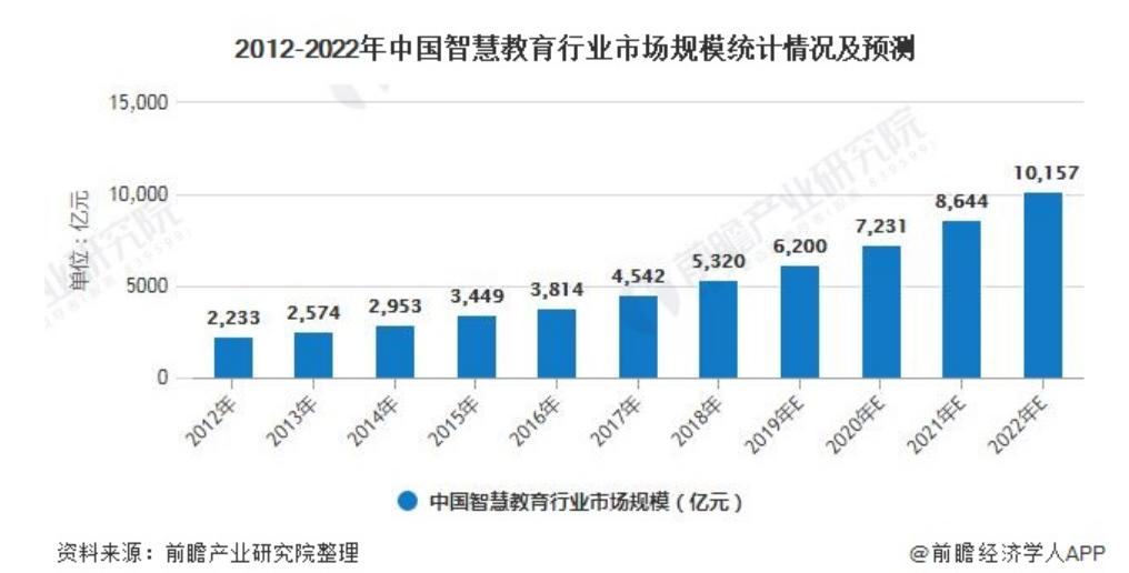 根据前瞻产业研究院的报告,2013年以来中国智慧教育行业就进入高速发展阶段,市场规模在今年预计能达到9057亿元,明年有望突破万亿大关。