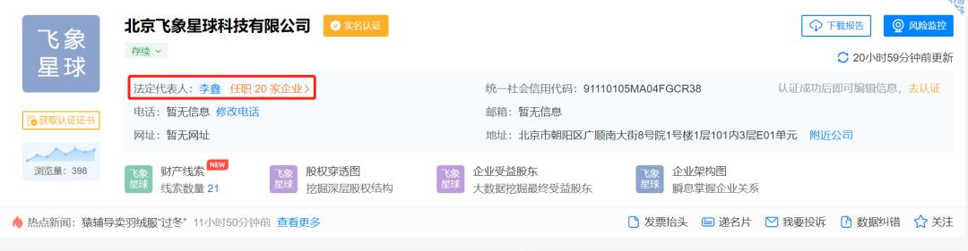 天眼查信息显示,北京飞象星球科技有限公司已于日前成立,由猿辅导的关联公司北京小猿文化传播有限公司全资控股,注册资本1亿,法人也是一个熟悉的面孔——猿辅导联合创始人李鑫。