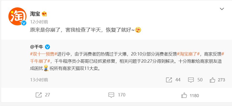 很快,阿里巴巴卖家工作台千牛跳出来承认错误,表示由于预售过于火爆,经商家反馈千牛服务器不堪重负出现崩溃,经过抢修已经在20:27解决。