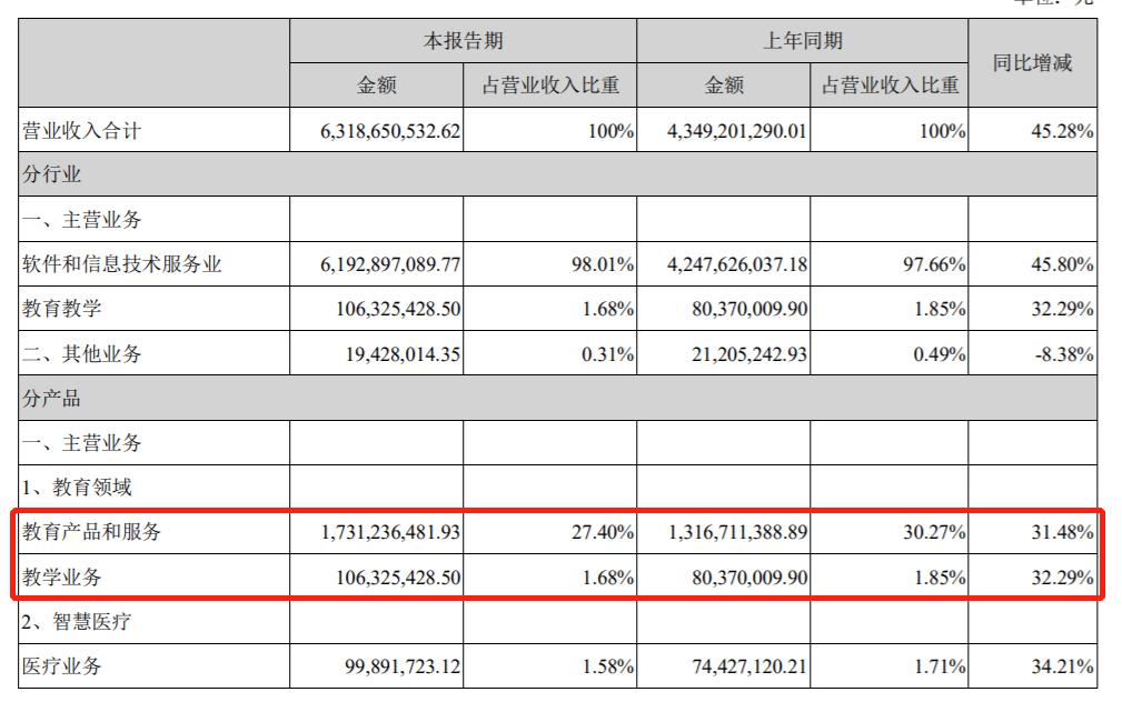 根据2021年的半年度报,科大讯飞总营收为63.19亿,同比增长45.28%;扣非后净利润2.09亿,同比暴涨2720.8%。其中,教育产品和服务营收达到了17.31亿,营收占比为27.4%。