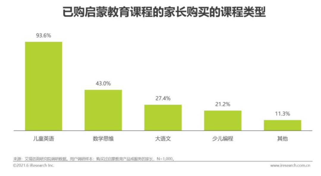 数据显示,已购买启蒙课程的家长中,93.6%选择了儿童英语,43%选择了数学思维。