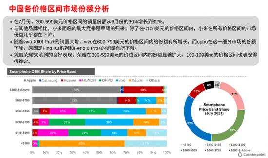 市场研究机构Counterpoint数据显示,2021年7月份中国智能手机市场份额中,小米占据了15%,荣耀仅仅落后小米2%,市场份额迅速恢复到了13%。