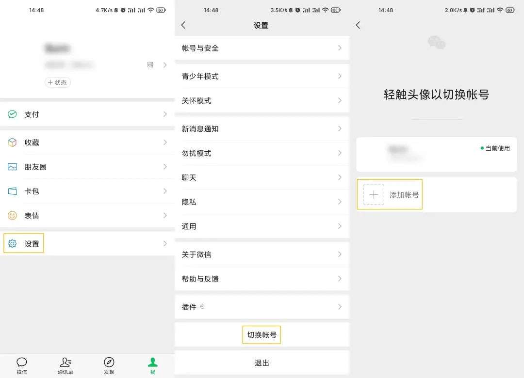 打开微信-选择【我】的页面-点击【设置】-点击【切换账号】-点击【添加账号】。