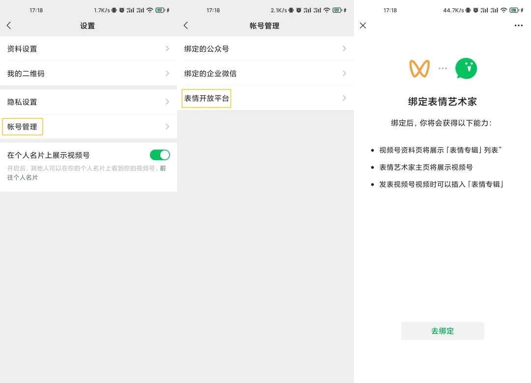 具体路径:【发现】-【视频号】-【我的视频号】-【右上角三点】-【账号管理】-【表情开放平台】-【绑定表情艺术家】。