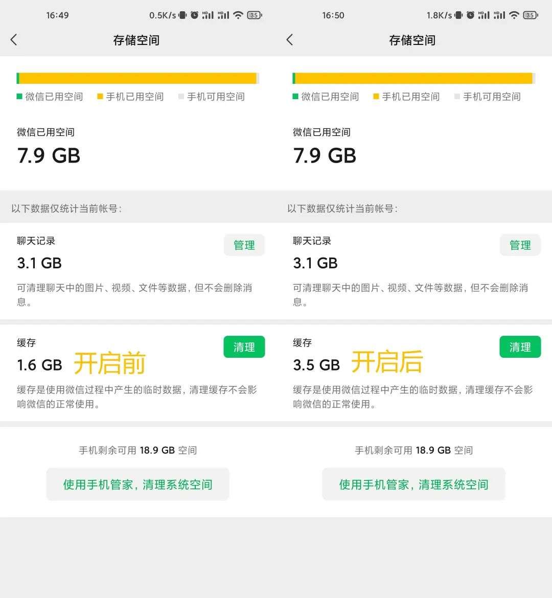 这功能开启前后,效果还是非常明显,可清理的缓存大小翻了一倍多。