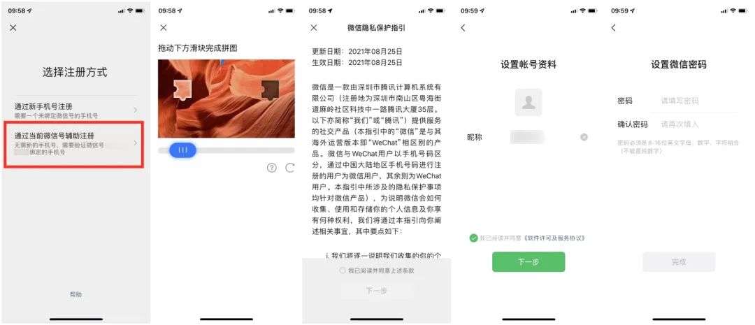 【拼图验证】-【同意隐私条款】-【设置账号资料】-【设置微信登录密码】。