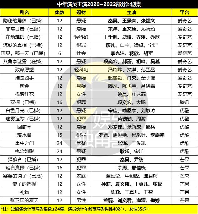 其中,后者之中有这两年比较多的集数在24集之内短剧集精品项目,以类型化题材居多,更偏现实题材更厚重的项目,例如悬疑罪案、社会话题、女性家庭等,这些项目非常需要经历气质有一定积累,表演上发挥稳定,也有一定知名度的演员来参与,于是熟龄演员的需求量激增。