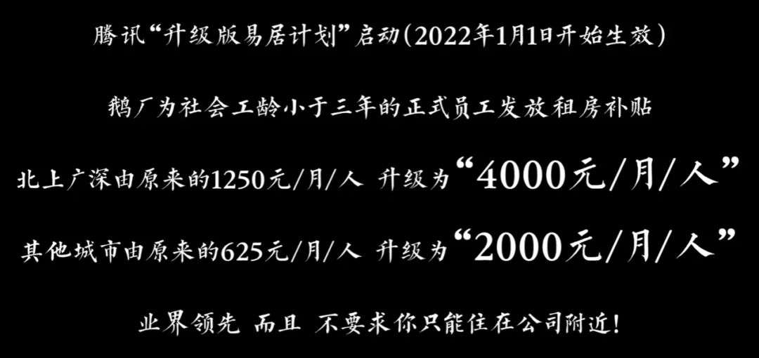 和薪酬一起「卷」起来的还有福利,前一段时间,三七把员工免息购房借款的总额提到了3000万;而就在上周,腾讯也宣布自2022年1月1日起,将为社会工龄小于3年的正式员工发放更高的租房补贴:北上广深由每月1250元上调至4000元,其他城市则由每月625元上调至2000元。