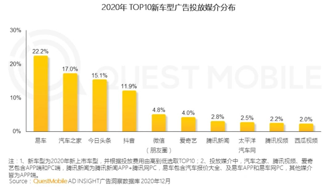 在商业变现环节,QuestMobile发布的《2020汽车行业营销洞察盘点报告》显示,在包括汽车垂直平台、长视频、短视频及信息流平台中,易车在2020年TOP10新车型广告投放媒介中占据22.2%的份额,超过汽车之家成为汽车厂商新车广告投放首选平台。