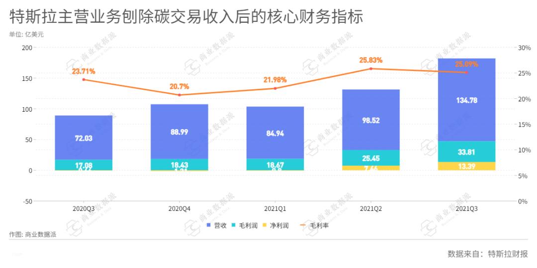 从去年第三季度到今年第三季度,刨除碳积分销售收入的2.79亿美元,特斯拉营收分别为72.03亿美元,88.99亿美元,84.94亿美元,98.52亿美元,134.78亿美元,三季度营收比去年同期增长87.11%。毛利润分别为17.08亿美元,18.43亿美元,18.43亿美元,25.45亿美元,33.81亿美元,三季度相比去年同期增长97.95%之多,毛利润率为25.08%。